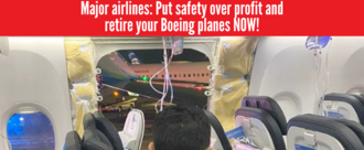 Stop working with Boeing and retire your Boeing planes NOW!Out of Alaska Airlines' 314 operational airplanes, 73% of Alaska Airlines' fleet are Boeing planes. And United Airlines, one of the largest airlines in the world and one of Boeing's top customers, has more Boeing 737 Max 9 aircrafts than any other airline. They had five serious incidents with Boeing planes last week alone. Since 2020, there have been a shocking 1,800 service difficulty reports from airlines to government regulators about the Boeing 737 Max planes—from fuel leaks to engine stalls. But despite the glaring and egregious safety concerns with Boeing's production, Alaska Airlines, as of August 28, has transitioned to an all-Boeing fleet. The Alaska Airlines Boeing incident is the third major incident from Boeing in the past five years—with the two heartbreaking crashes in 2018 and 2019 that resulted in the death of more than 340 people. And less than a month before January's Alaska Airlines Boeing incident, employees at a Boeing supplier sounded the alarm about safety concerns with Boeing 737 Max jets, but their warnings were ignored, they were told to falsify records, and workers were retaliated against for speaking out. But this is not new. Boeing’s former CEO, Dennis Muilenburg, was fired and accused of creating a culture that put profits ahead of safety, notably telling Congress, "We don't 'sell' safety; that's not our business model." Even Boeing employees, journalists, and investigators have said that Boeing has cut corners and prioritized cost-cutting over safety and employee concerns. The dangerous and deadly trend of Boeing aircraft accidents is alarming. We can't allow Boeing to earn billions of dollars while potentially cutting corners and allowing glaring safety issues to slip past. Major airlines like Alaska Airlines, Delta Airlines, United Airlines, and Southwest Airlines must do the right thing and retire their Boeing planes. Will you sign the petition?466 of 500 Signatures