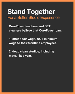 $30/hour for CorePower instructors, $20/hour for cleaners, and deep-cleaned studios 4x yearThis petition is for CorePower community members who • believe their instructors and studio cleaners deserve a fair wage • are sick (sometimes literally) of ringworm-infested studios222 of 300 SignaturesCreated by Dani Pizzazz