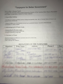 Taxpayers for Better Government1: Dual Office Holding - The State of Louisiana prohibits a person holding incompatible roles. See LA Revised Statue 42:64 (A)(1),(A)(4) and LA R.S. 42:62(A)(6) -Voting on matters as a Commissioner concerning his personnel issues, insurance settlements, and compensation ie (yearly budget). 2: Mismanagement of Public Funds - Overspending (≈$1.7M yearly budget). - 3M loan/bond without public ballot/vote. - Excessive spending on legal fees. 3: Overreach of Power - General disregard for State and Local laws (see point number one). - Ethics board violations. -Open meetings law violations.33 of 100 SignaturesCreated by heath harvey