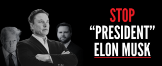 Stop "President" Elon Musk!Elon Musk bought his way into the White House, spending millions of dollars to help Trump win the 2024 election. But our communities, families, and rights are not for sale. While greedy and corrupt Musk threatens to slash taxpayer-funded public services we rely on—from Head Start child care programs to Social Security benefits—his own personal net worth has increased by $156 billion since the election. Musk does not care about the American people. He only cares about grabbing power so he can line his own pockets, stealing from everyday Americans while he and his billionaire buddies get even richer at our expense. Together, we can stop Elon Musk! Tell elected officials: The American people didn’t elect Musk. It's time to kick him out of the White House41,398 of 45,000 Signatures