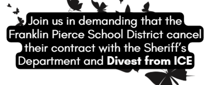 On August 19th, the Franklin Pierce School Board will vote on whether to renew their contract with the Pierce County Sheriff. We say: No more ICE in our schools. Invest in students, teachers, and families, not surveillance.
