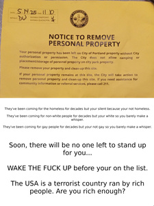 Portland continues to chase people around the city even though there is NO PLACE TO GO, many who swore to defend the US Constitution. These actions of running people out of public space, taking their things they need to survive, and even fining and jailing them, are un-constitional!!! In no place in the constitution, does it say, they can not be in public space. Portland has a long history of standing up against those who would harm others, unless the victim is homeless. With the President of the United States (1) now directing federal agents to go after homeless people across the entire country, we need to be protecting people even more then ever. The methods that have been used for decades do not work and without sufficient places for people to go, you are making it harder for people to survive not to mention get off the streets. Mayor Wilson even admits that he is NOT helping with this article (2) and is increasing the harassment (3).